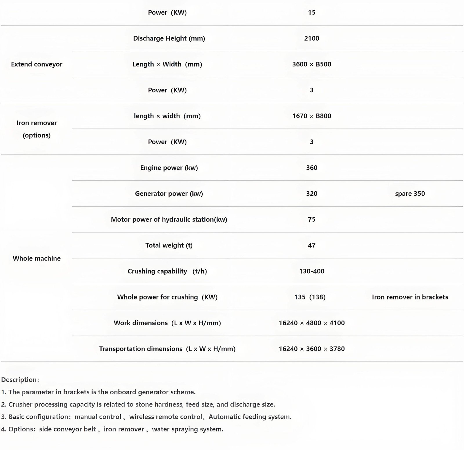 Optional: side conveyor belt, iron remover.